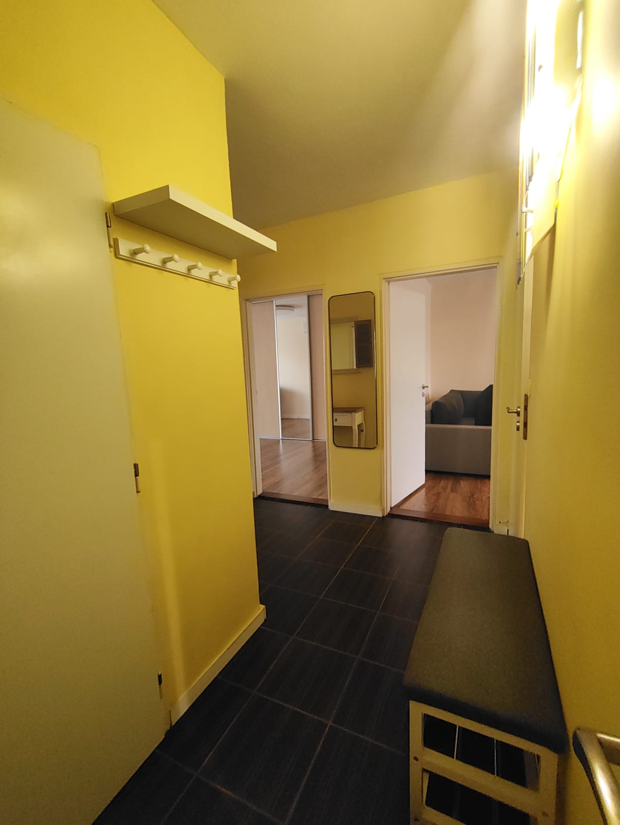 Byt je logicky členený na vstupnú halu so samostatným šatníkom, tri nepriechodné izby (obývacia izba, spálňa, detská izba), kúpeľňu, oddelenú toaletu a kuchyňu s praktickou komorou a výstupom na balkón.